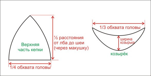 1. Наложи выкройку основной части кепки на ткань с изнанки и обведи. Прибавь со всех сторон по 0,5 см на шов. Вырежи 4 такие детали. Затем наложи на ткань с изнанки выкройку козырька, обведи, прибавь со всех сторон по 0,5см и вырежи две детали козырька.