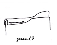 Подогни переднюю сторону и закрепи подгибку “ручной строчкой”, “потайным” швом или тамбурным. Если ты не оставила ткани на подгибку, можно этот край обработать по-другому: взять равную по длине ленточку или тесьму, сложить ее вдоль изнанка к изнанке и наложить на обрабатываемую сторону так, чтобы срез оказался внутри ( рис. 13) и пришить тесьму “ручной строчкой” или тамбурным швом, следя, чтобы и на лицевой стороне и с изнанки тесьма была прошита.
