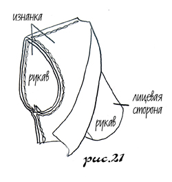 12. С лицевой стороны вставь рукав в пройму присборенной стороной (рис.21) так, чтобы шов рукава оказался снизу и прошей вдоль края. Во вторую пройму вшей другой рукав.