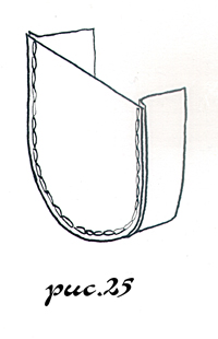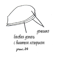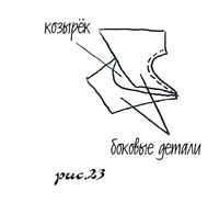 3. Сложи боковые детали лицевая сторона к лицевой, между ними вложи козырёк так, чтобы совпали не прошитая сторона козырька и прямая сторона боковых деталей (рис.23).
