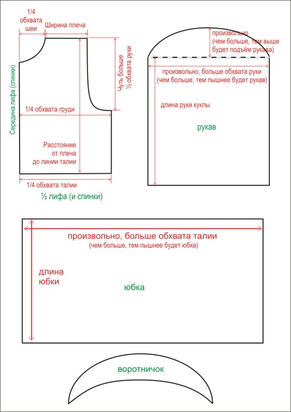 1. Сложи основную ткань пополам лицевая сторона к лицевой и приложи выкройку лифа так, чтобы сторона АВ совпала со сгибом ткани. Обведи, прибавь по краю 0,5см на шов и вырежи. Затем опять наложи на ткань с изнанки выкройку лифа и обведи. Вдоль стороны АВ прибавь 1-1,5см на застёжку, с остальных сторон – по 0,5 см на шов. Вырежи две такие детали: у одной вырез для рукава направлен вправо, у другой – влево. Затем на гипюр с изнанки наложи выкройку рукава, обведи, прибавь по краю 0,5см и вырежи 2 такие детали. После этого наложи на гипюр с изнанки выкройку воротничка, обведи и вырежи одну такую деталь. Теперь на основной ткани с изнанки обведи выкройку юбки, прибавь по 0,5 см на шов вдоль коротких и одной длинной стороны, и 1см на подгибку вдоль оставшейся стороны, вырежи. На гипюре с изнанки обведи выкройку юбки, прибавь вдоль коротких сторон по 0,5см на шов и вырежи. Вдоль длинных сторон прибавку делать не надо, потому что гипюровая юбочка должна быть немного короче основной.