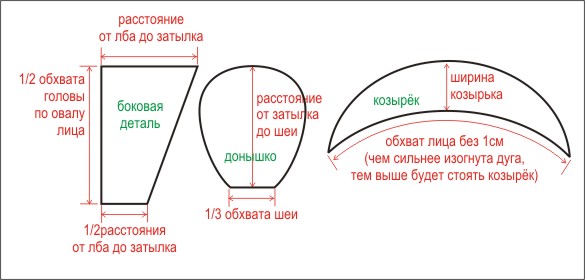 1. Сложи ткань пополам лицевая сторона к лицевой, приложи выкройку боковой детали так, чтобы верхняя сторона совпала со сгибом ткани, обведи. Прибавь со всех сторон по 0,5см на шов и вырежи две такие детали. Затем наложи на ткань с изнанки выкройки остальных деталей, обведи их, прибавь по краям по 0,5см и вырежи 2 детали козырька и 2 детали донышка. После этого вырежи 1 деталь козырька без прибавок на швы из картона.