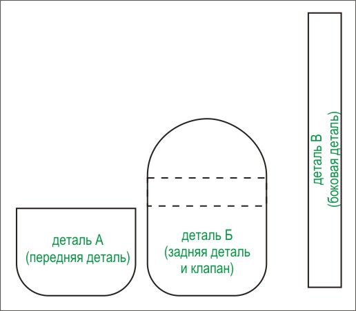 1. Наложи детали выкройки на ткань с изнанки и обведи. Со всех сторон прибавь по 0,5см и вырежи каждой детали по одной. Затем наложи на ткань с изнанки деталь Б и обведи её верхнюю часть до пунктирной линии. На этой детали прибавь со всех сторон также по 0,5см и вырежи. После этого вырежи из тонкого картона 1 деталь А и 1 деталь Б без прибавок на швы.