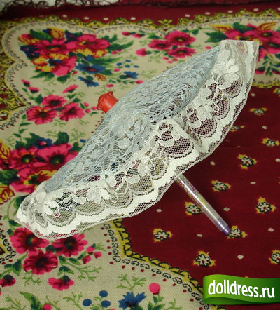 5. Возьми кусок кружева, немного длиннее нижнего края юбки и пришей, присбаривая, по нижнему срезу гипюровой юбки. Концы кружева прошей вместе с изнанки.