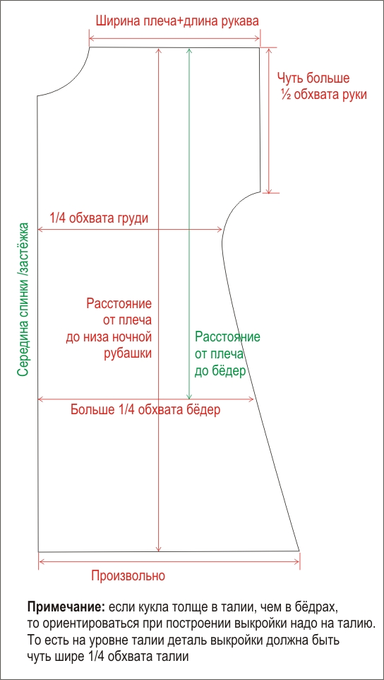 Тебе понадобится: материя, пуговица и что-нибудь для отделки – шитье, кружева или ленточки.Как построить выкройку, показано на рисунке. Половинка спинки и полочка выглядят одинаково.