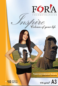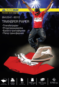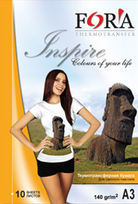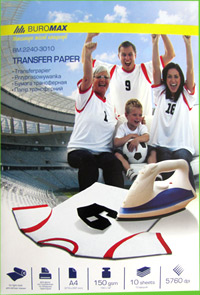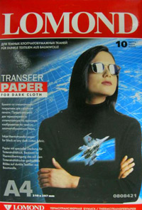- термотрансферная бумага (её также называют бумагой для термопереноса). Она продаётся в магазинах канцтоваров и в магазинах цифровой техники в отделе бумаги для принтеров. Такая бумага бывает двух видов: для светлых тканей и для тёмных. В первом случае бумага покрыта прозрачным покрытием, на которое наносится изображение и которое потом будет перенесено на ткань в виде тонкой плёночки. Если ткань не белая, то все белые объекты в изображении станут того же цвета, что и ткань, т.к. плёночка прозрачная, а белых чернил в принтерах не бывает. В целом изображение приобретёт оттенок ткани, не изменится только чёрный цвет. На бумаге для тёмных тканей нанесена белая непрозрачная плёночка, поэтому оттенок изображения не поменяется, но граница картинки будет хорошо видна.